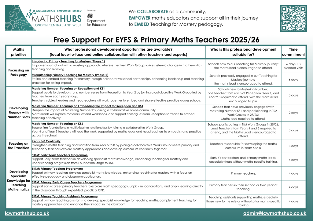 Maths leads will explore materials, attend workshops, and support colleagues from Reception to Year 3 to embed teaching effectively.