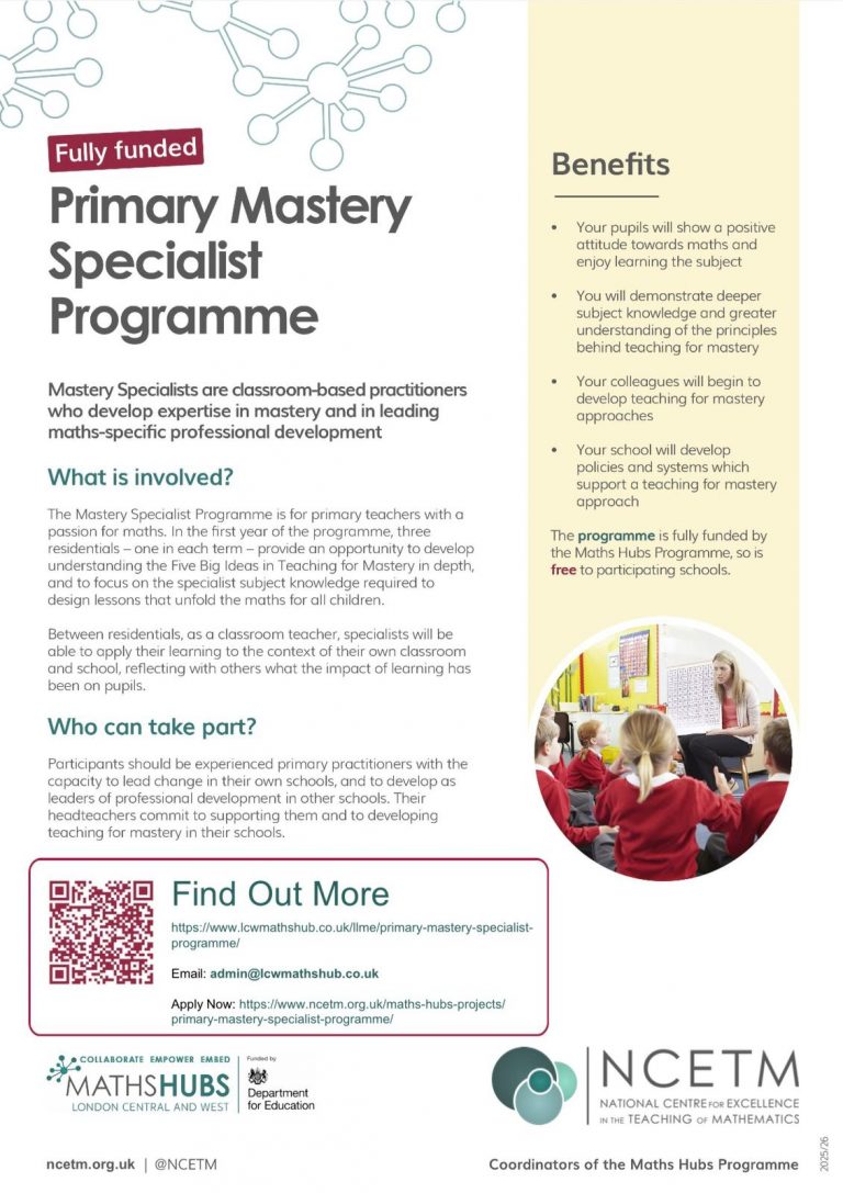 This work is being carried out by your Maths Hub Lead School, which holds a grant with the Department for Education (DfE) to deliver the Maths Hub programme.