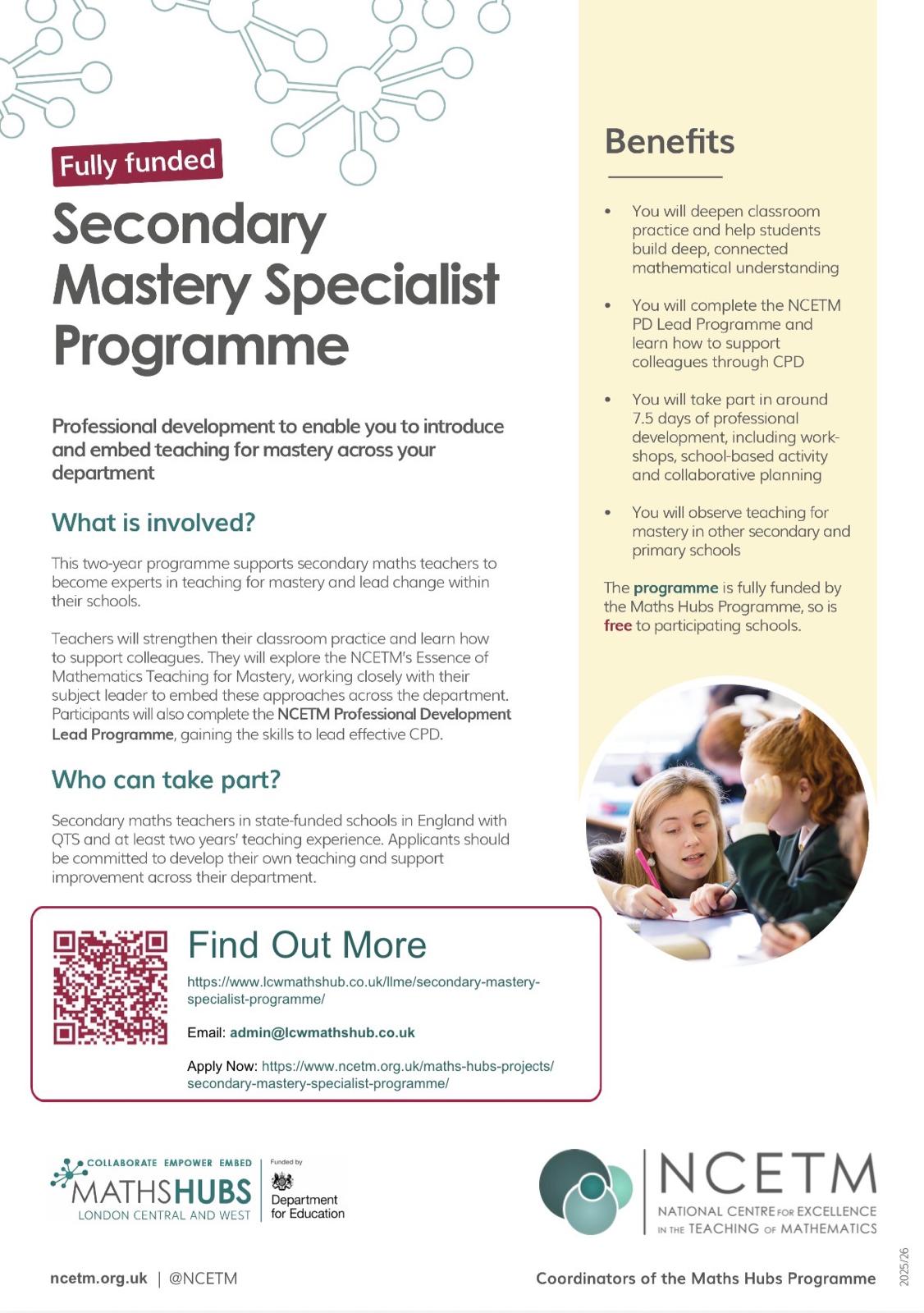 This work is being carried out by your Maths Hub Lead School, which holds a grant with the Department for Education (DfE) to deliver the Maths Hub programme.